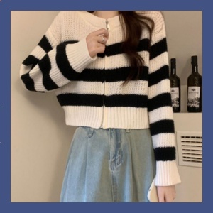 여성 2컬러 데일리 크롭 단가라 스트라이프 니트 집업sy_